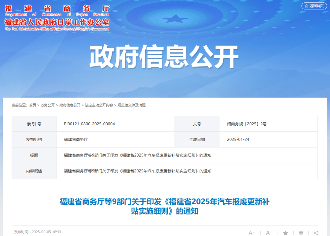 近日,福建省商务厅等9部门印发关于《福建省2025年汽车报废更新补贴实施细则》的通知。